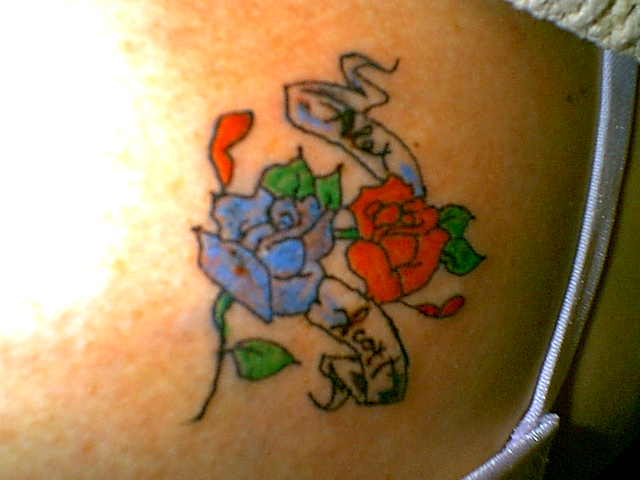 33/18/2006 - I did one on My brother Jeff's girlfriend Joanie (it is her very first one.... its on her left breast top) Its old school style Roses and banner with her 2 children's names in it , Daughter Alex (short for Alexis) and Son Scott. My brother Jeff signed the names ...